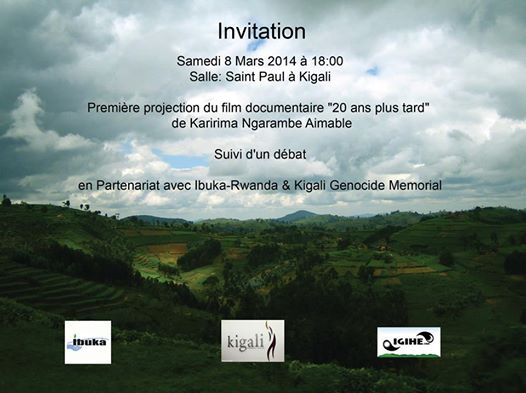 “Vingt ans plus tard” rend hommage à ces hommes qui ont, à leur manière, eu le courage de lutter pour comprendre. Vingt ans plus tard, ont-ils trouvé une réponse ? Vingt ans plus tard, ils continuent leur quête de l’absolu sans être certains de le trouver, mais avec l’intime conviction qu’accepter qu’il n’y a pas de réponse, c’est accepter que l’humanité n’existe pas …En partenariat avec Ibuka-Rwanda & Kigali genocide Memorial, ce documentaire sera suivi d’un séance questions/réponses en présence du réalisateur Karirima Ngarambe AimableEntrée libre demain le 08/Mars/2014 Salle saint Paul, Kigali.EndPost by Al